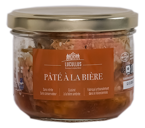 Composition : Porc origine France 93% (gorge, épaule, foie), bière ambrée origine Hauts-de-France3% (gluten), sel, protéines de lait, gélatine bovine, poivre blanc, ail, thym.