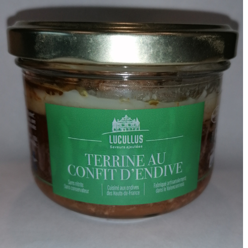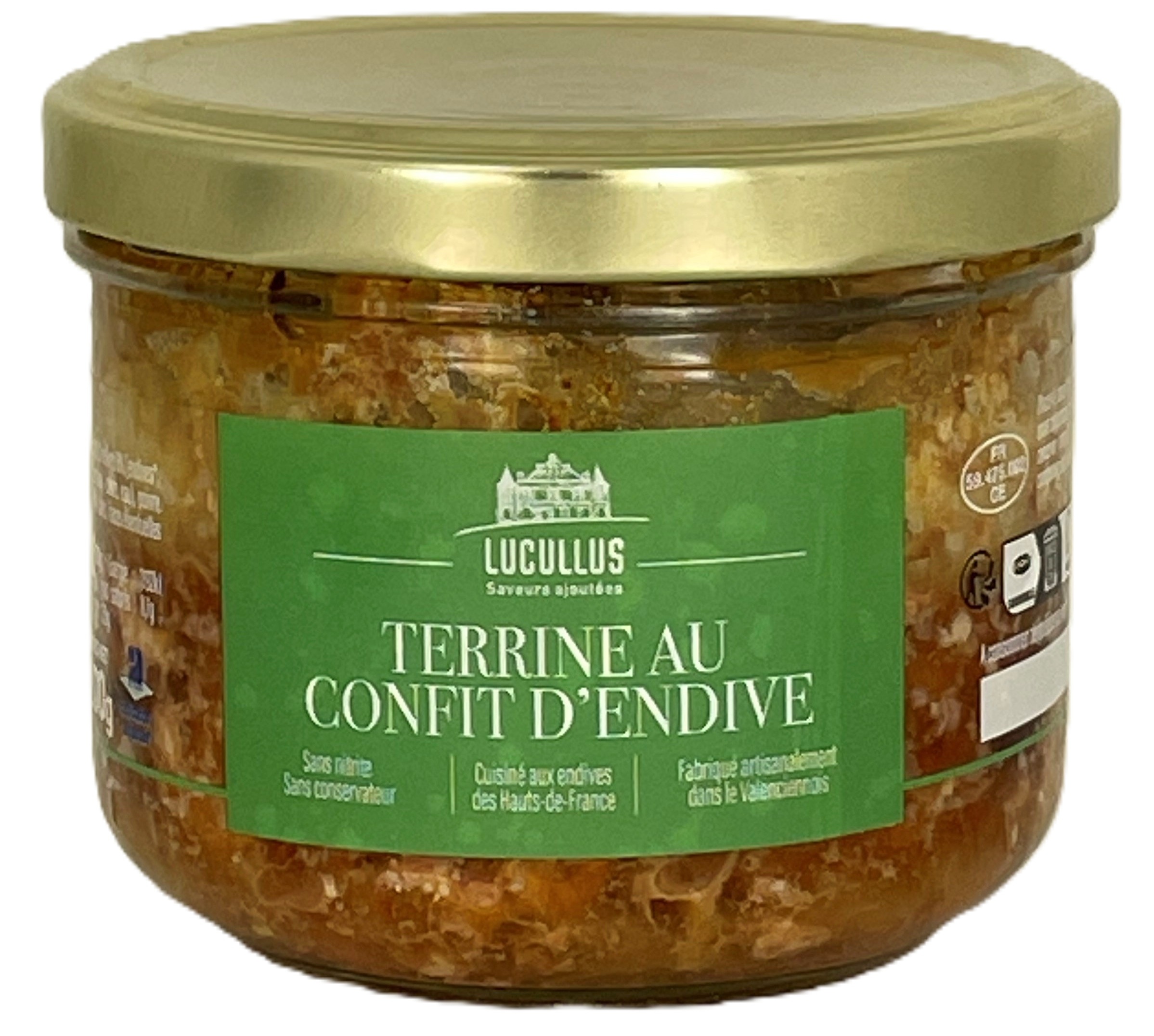 Composition : Porc* 89% (gorge, épaule, foie), confit d’endives 8% (endives*, sucre, vinaigre d’alcool, gélifiant : pectines, sel, caramel (sucre, eau), poivre blanc), fécule de manioc, sel, gélatine bovine, poivre blanc.